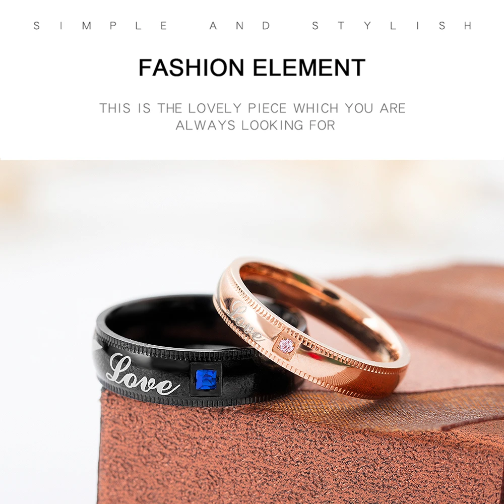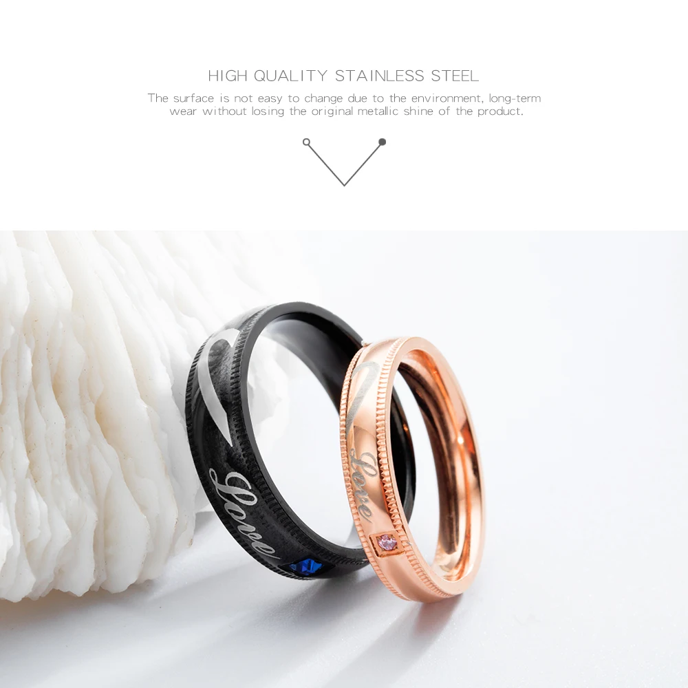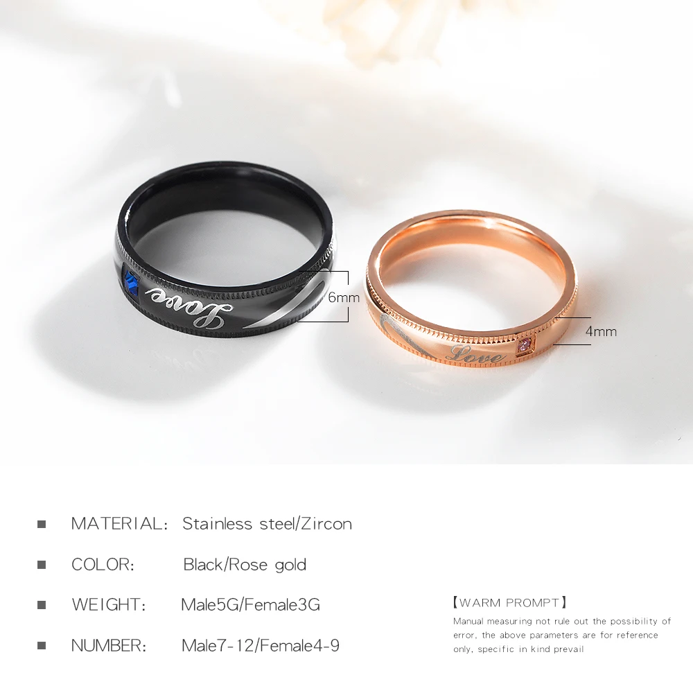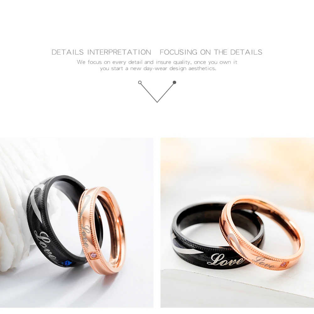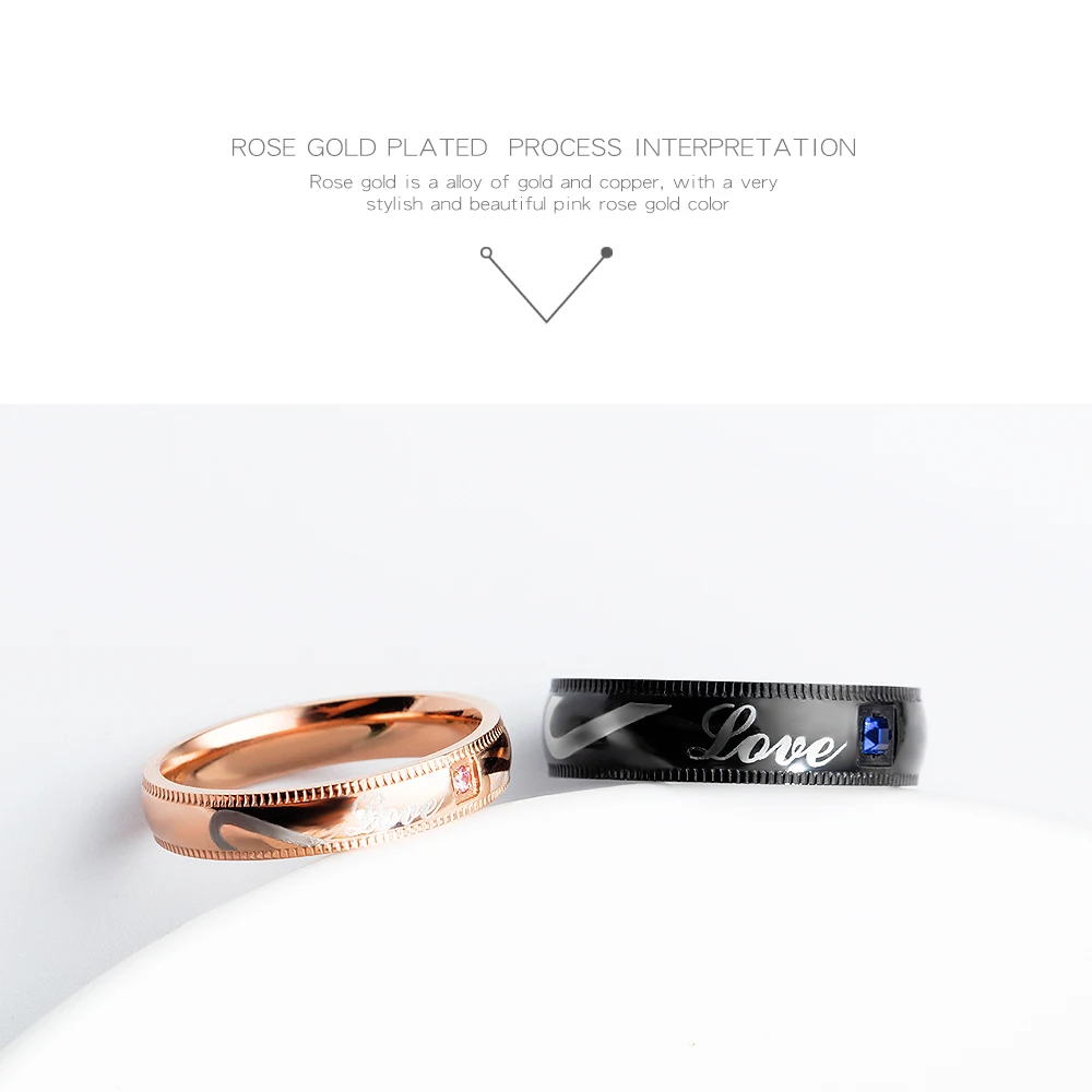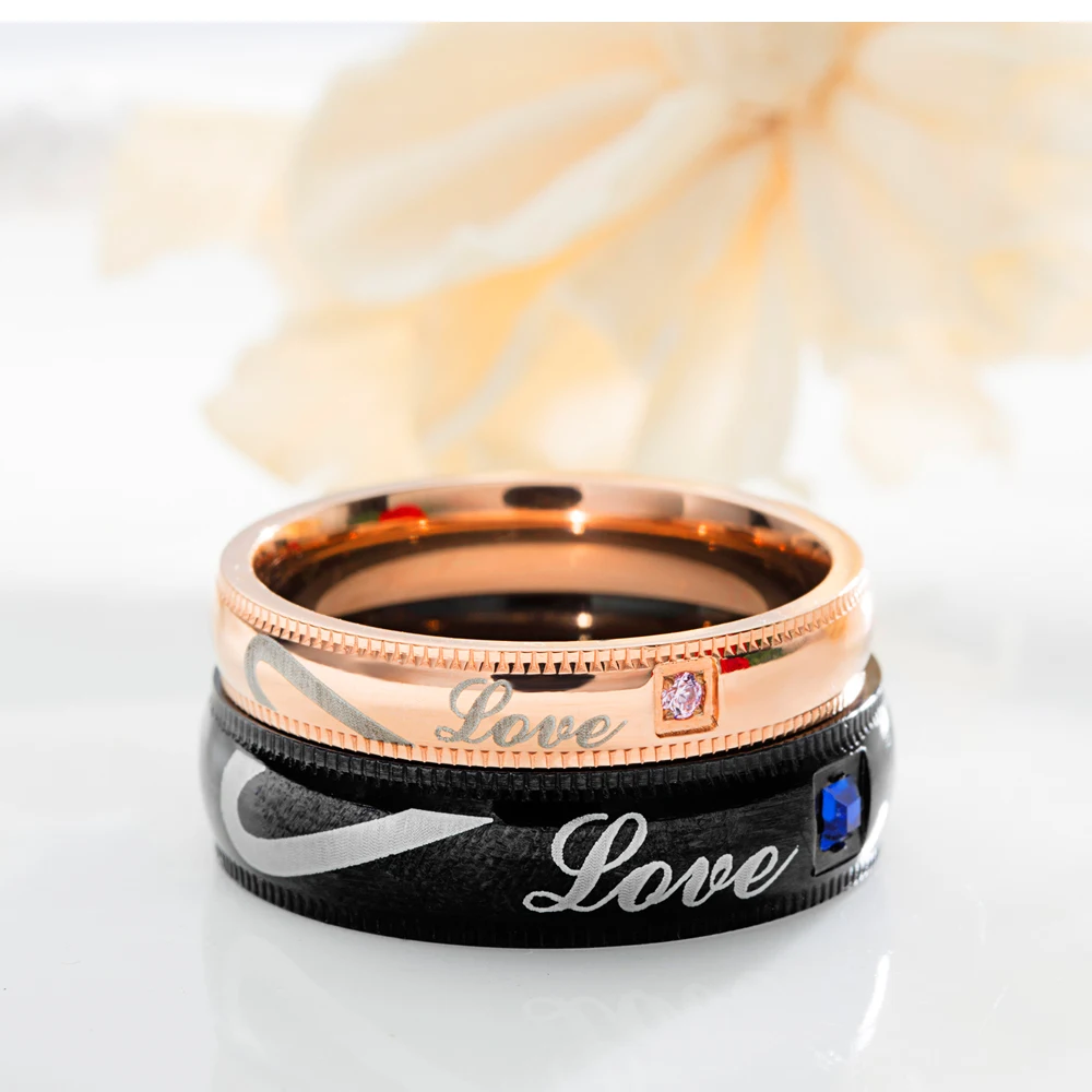 Romantic laser engraved black gold plated diamond wedding rings for men and women